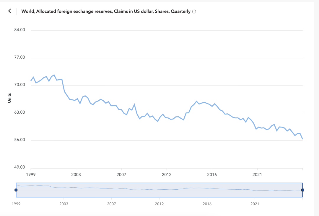 国际货币基金组织(IMF)日前发布的全球外汇储备货币构成数据(COFER)显示,今年二季度末,美元在全球外汇储备中占比56.32%,较一季度末下降了1.47个百分点。这一比例已跌至1995年以来最低水平。