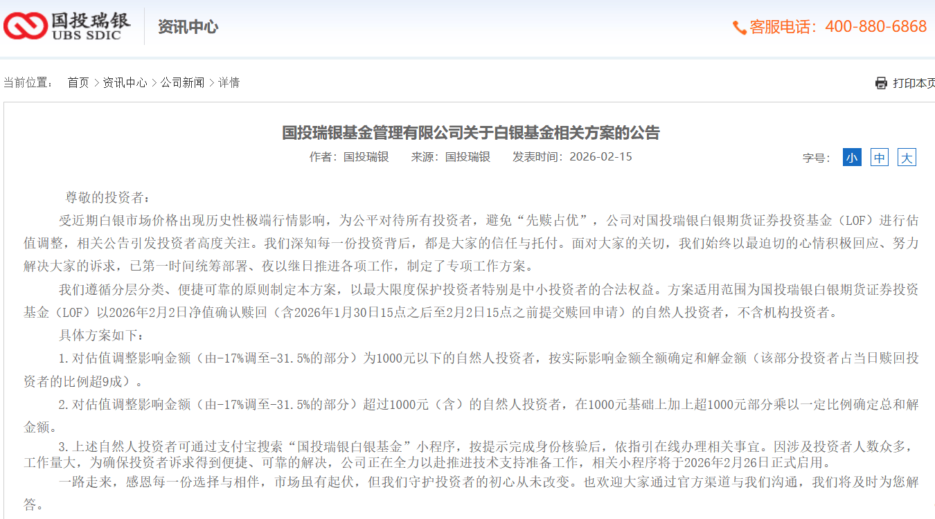 2026-02-18球速体育,球速体育官方网站,球速体育APP下载中新经纬2月16日电 15日,国投瑞银基金管理有限公司(下称“国投瑞银”)发布《关于白银基金相关方案的公告》。