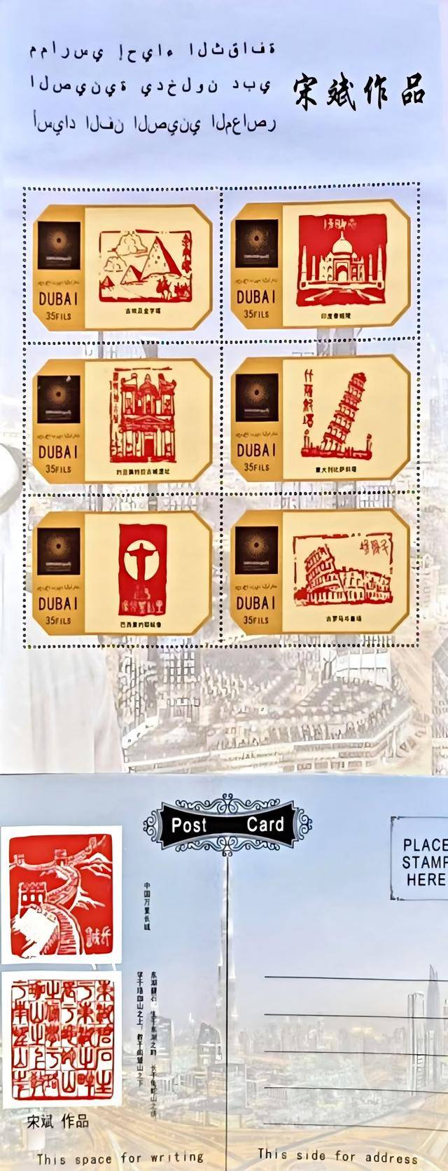 作为本次活动的文化亮点,主办方特别向参与者赠送了由篆刻家宋斌教授创作的《世界七大奇迹印谱(双语)》全套邮票及新春大礼包。礼包中不仅包含春联、福字等传统春节饰品,还配有介绍春节文化与楚派篆刻的双语手册。邮票以篆刻艺术呈现世界七大奇迹,融合楚派印风与古肖形印之韵,刀法细腻、气韵生动,既展现中华金石之美,也传递文明互鉴之理念。