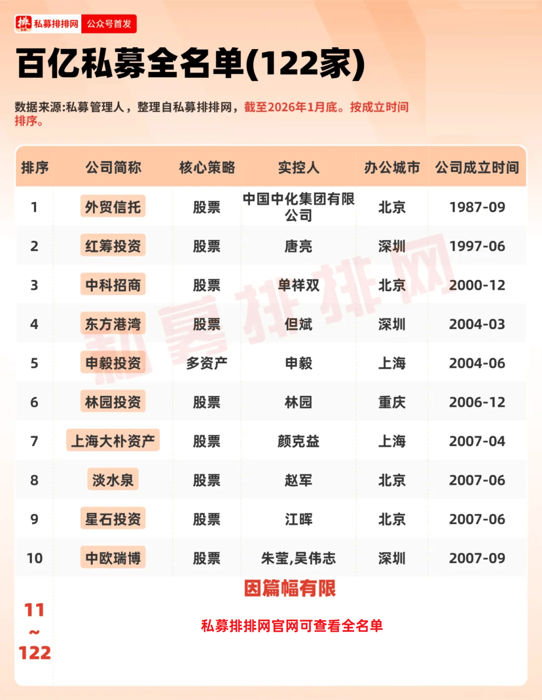 根据私募排排网数据,截至2026年1月末,我国百亿私募达122家,相比2025年末的112家,新增10家。其中,国源信达、恒毅持盈(深圳)私募、腾胜投资、姚泾河私募、泰康稳行(武汉)私募、四川发展证券投资、宏锡基金等8家私募为首次突破百亿;重回百亿私募阵营的有5家,分别是:洛书投资、遂玖私募、展弘投资、汐泰投资、申毅投资。另外还有3家私募退出百亿阵营。