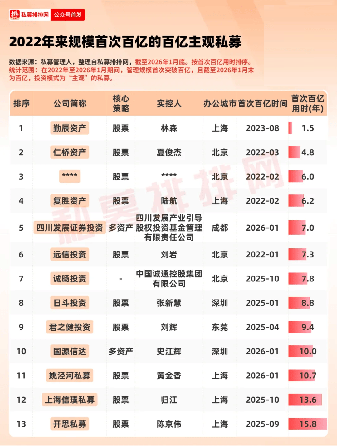 根据私募排排网数据,2022年至今首次突破百亿规模、且截至2026年1月末仍保持在百亿级别的主观私募仅有13家,包括姚泾河私募、国源信达、四川发展证券投资、上海信璞私募、诚旸投资、开思私募、君之健投资、日斗投资、勤辰资产、仁桥资产、复胜资产、远信投资等。