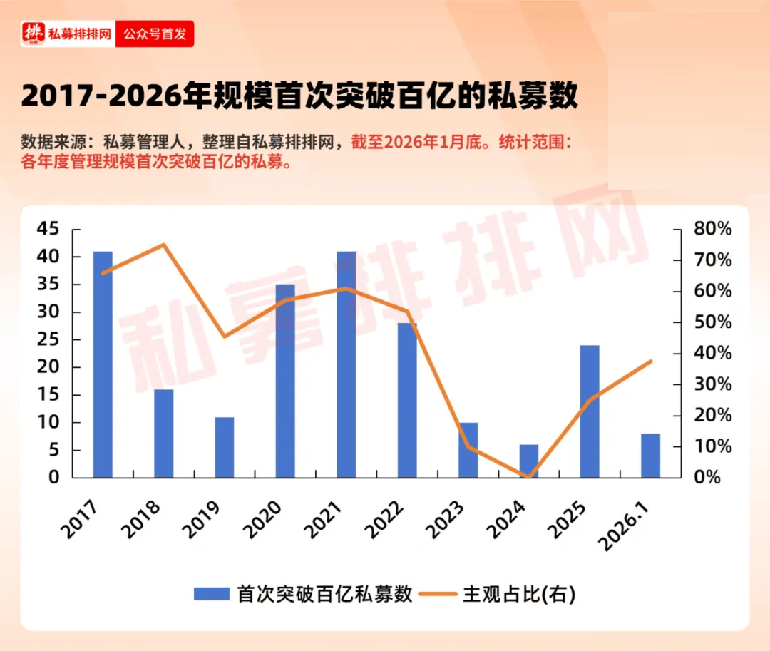 经笔者梳理发现,从历史数据来看,首次突破百亿规模的私募中,主观私募占比整体下滑,尤其在2022年至2024年的市场调整阶段时更为突出。2018年至2021年间,共有103家私募首次跨入百亿行列,其中主观私募为62家,占比达60%;而2022年至今(截至2026年1月),新晋百亿私募共76家,其中主观私募仅25家,占比降至33%。