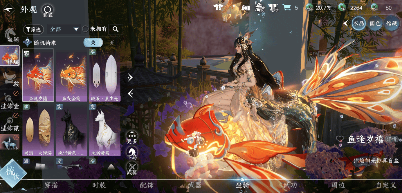 815件配饰,105只坐骑,其中不少都是祥瑞坐骑,行走速度不输氪金千元的天赏坐骑,放在衣柜里根本穿不完!