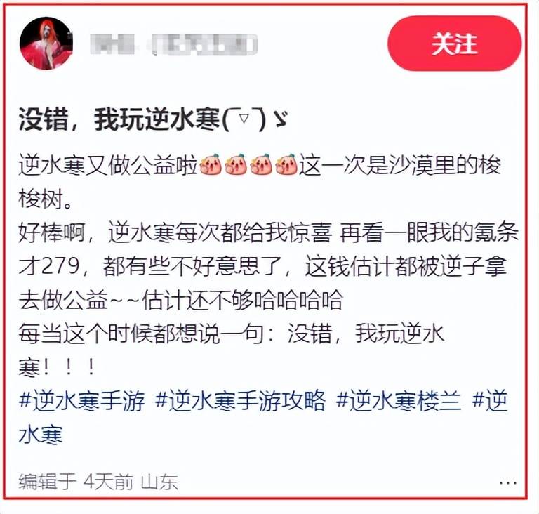 该公益一经曝光,网上全是逆水寒玩家与有荣焉的发帖,还有玩家晒出自己的游戏氪条,3年就充了279元,但真是没白花。想到这些钱都被逆水寒拿去做公益,还有些不好意思呢!