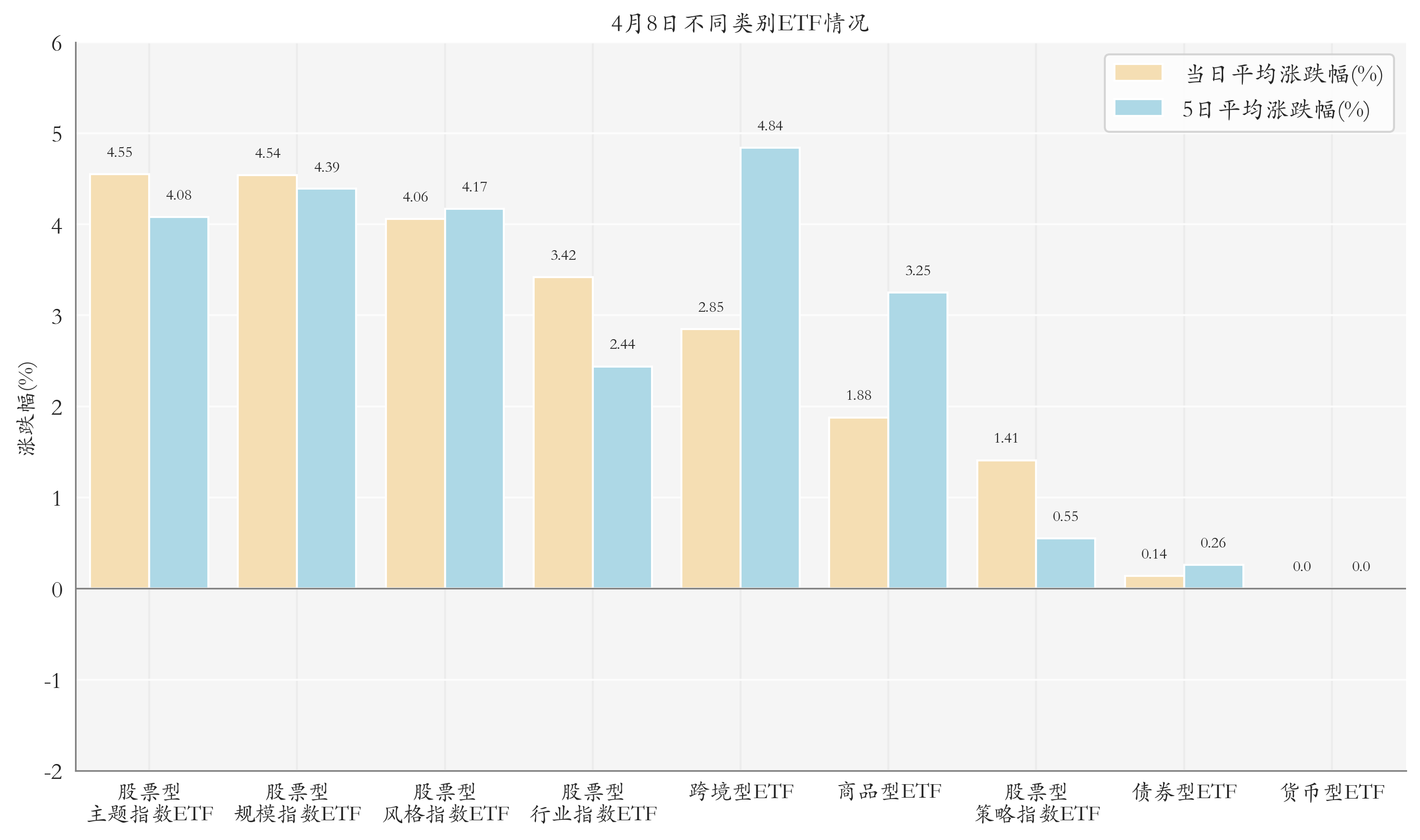 根据ETF基金的规模和涨跌幅计算得出不同分类情况下各类ETF基金的平均涨跌幅。