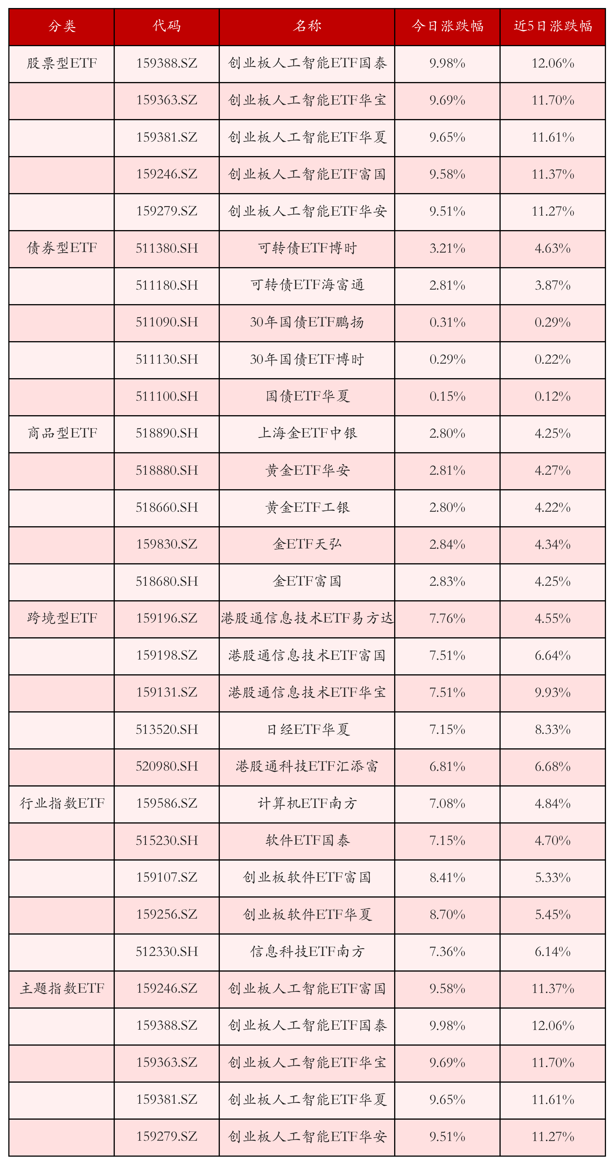 从不同投资种类、行业、主题的ETF产品中找出今日走势行情排名前5的ETF基金,今日涨幅靠前的ETF产品如下表所示。股票型ETF中涨跌幅排名前3位的ETF产品分别为创业板人工智能ETF国泰(159388.SZ)、创业板人工智能ETF华宝(159363.SZ)和创业板人工智能ETF华夏(159381.SZ),今日收益率分别为9.98%、9.69%和9.65%。